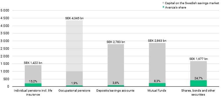 Avanza operates in the Swedish savings market, which has one of the highest proportions of equity and fund investors in the world. The market has grown by an average of 7% a year in the last ten years. An estimated 70% of the population save in funds.