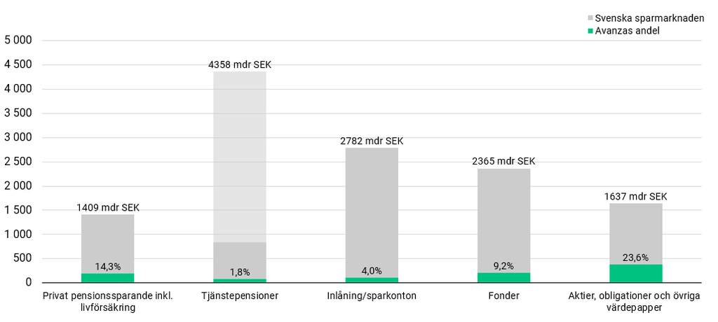 Avanza vänder sig till den svenska sparmarknaden som har en av världens högsta andel aktie- och fondsparande. Marknaden har under den senaste tioårsperioden vuxit med i snitt 6% per år, och uppskattningsvis 70% av befolkningen sparar i fonder.