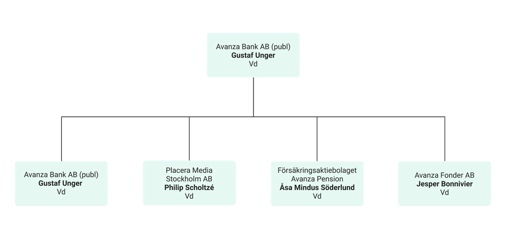 Koncernen består av det noterade moderbolaget Avanza Bank Holding AB (publ) och fyra helägda verksamhetsdrivande dotterbolag.